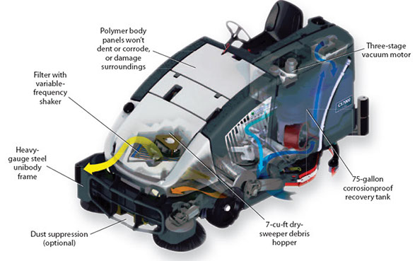 La combinación de barredora-restregadora de este modelo reinventa toda una clase de equipo mediante la reducción en su coste total, incluyendo la operación, la mano de obra y el mantenimiento, incrementando de manera eficaz la economía de combustible y la eficiencia en tiempo de ejecución.