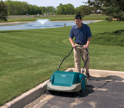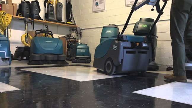La Tennant T5 Walk Behind es ideal para espacios reducidos y barrido alrededor de bastidores de ropa o mostradores.